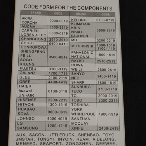 همچنین طریقه ست کردن کنترل با کولر گازی بسیار ساده است فقط کافیست برند مورد نظر را پیدا کنید برای مثال کولر شارپ در محدوده1800-1819 قرار دارد یعنی 19 فرکانس برای این برند در کنترل ذخیره است که شما با نگه داشتن دکمه set به مدت پنج ثانیه میبینید که در صفحه کنترل یه قسمت چهار رقمی وجود دارد که شروع به چشمک زدن میکند ، برای رسیدن به عدد 1800 که برای مثال می خواهیم انجام دهیم شما هر بار که دکمه temp را فشار دهید یک عدد جلو می رود و اگر دکمه را نگه دارید صد عدد جلو میرود ،کافیست شما چند لحظه دکمه temp را نگه دارید تا به نزدیکی عدد 1800 برسید سپس با هر بار فشار دادن temp یک عدد به جلو میروید (در حین وارد شدن کد 1800_1819 شما کنترل را روبروی پنل کولر گازی میگیرید هر شماره که روی کولر عکس العمل دیدی همان شماره مناسب کولر شماست)